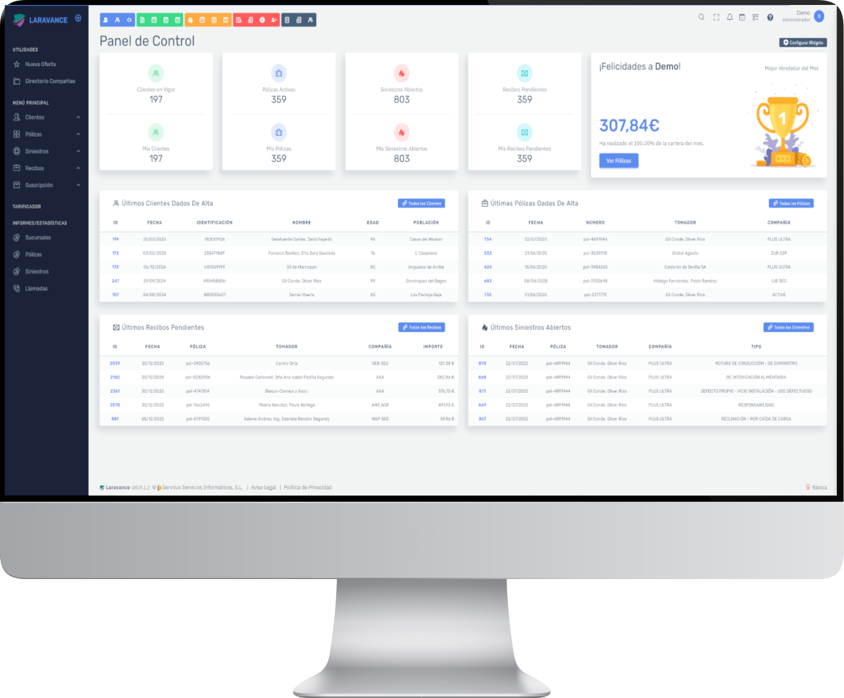 Es una Aplicación de Gestión de Seguros, creada y diseñada por Expertos, siguiendo los últimos estándares, y aplicando el conocimiento adquirido desde hace varios años en el mundo de los Seguros y la Tecnología. El resultado es una aplicación moderna, modular y conectada con Servicios de Terceros, que convertirá la manera en la que se relaciona con sus clientes y con su trabajo, consiguiendo una gestión del tiempo óptima para poder dedicarse a lo que más le importa.